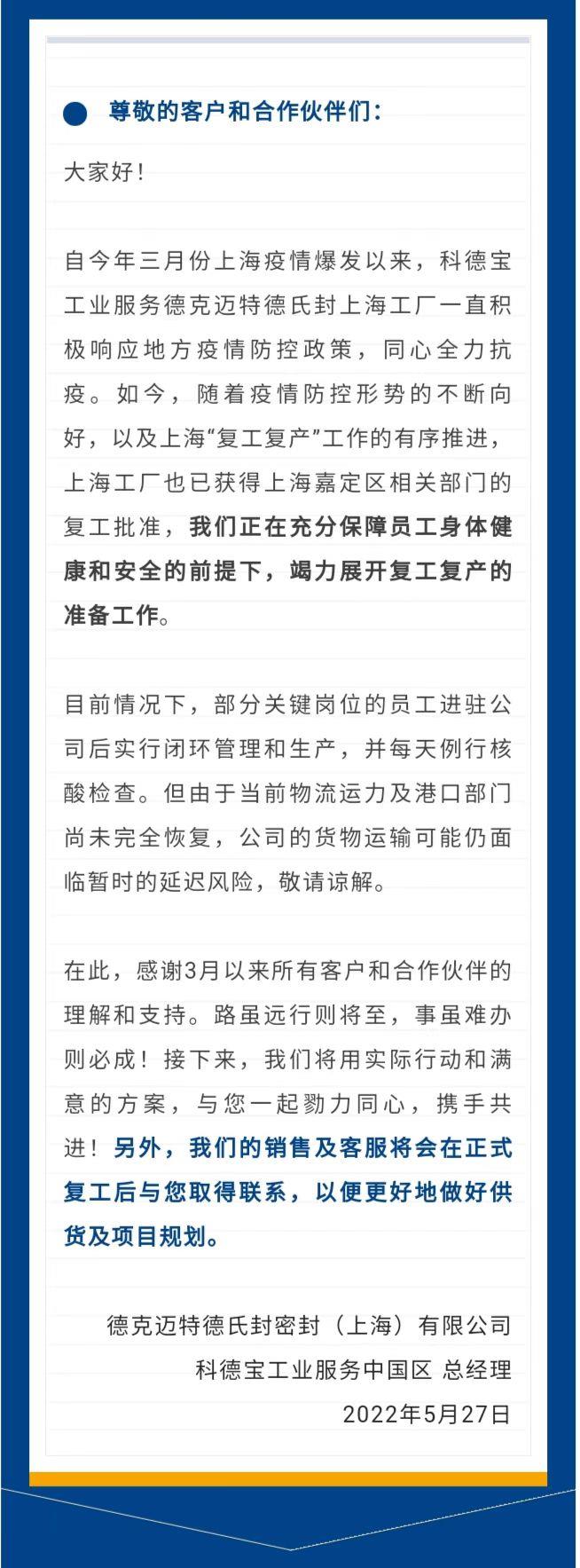 這里轉(zhuǎn)發(fā)一封來自科德寶工業(yè)服務(wù)中國(guó)區(qū)總經(jīng)理(同時(shí)也是德氏封密封中國(guó)公司總經(jīng)理)關(guān)于科德寶工業(yè)服務(wù)中國(guó)區(qū)/德氏封密封中國(guó)區(qū)的復(fù)工信。截止本文發(fā)文時(shí)間6月16日,科德寶工業(yè)服務(wù)中國(guó)區(qū)/德氏封密封中國(guó)區(qū)已全面復(fù)工,工廠正在全力以赴的恢復(fù)產(chǎn)能和物流服務(wù)容量。作為德氏封的正式授權(quán)經(jīng)銷商,我們嘉承機(jī)械歡迎大家繼續(xù)選擇我們的產(chǎn)品和服務(wù)。我們的服務(wù)熱線是 0086 13916031098 張經(jīng)理,公司郵箱 shanghaijiacheng@163.com,也歡迎朋友們登錄我們的網(wǎng)站m.taoye.net.cn下載樣本和參考資料。